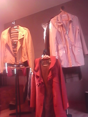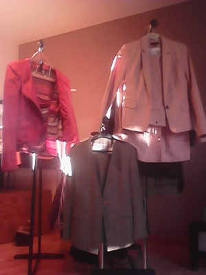 Manteaux 20€, trench 10€, anoraks 10€, blousons simili cuir (divers coloris) 15€, ensemle veste pantalon 20€, ensemble veste jupe Emporio Armani  30€, robes 5 et 10€, pulls 5€, pantalons 5 et 8€...